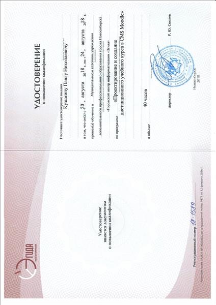 | Муниципальное казенное учреждение дополнительного профессионального образования города Новосибирска "Городской центр информатизации "Эгида" | "Проектирование и создание дистанционного учебного курса в CMS Moodle" | 40 | | 20.08.2018 | 24.08.2018 | Файл (JPG; 33Кб) |